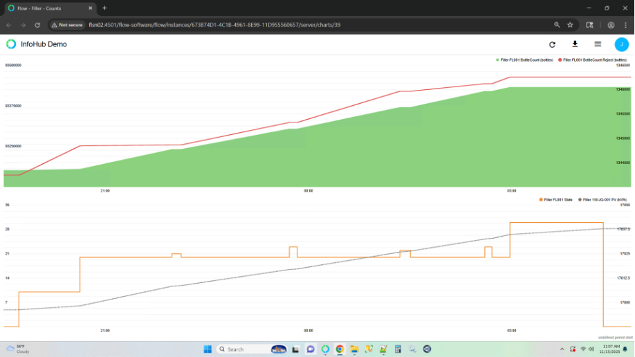 Each filler has a maximum throughput capability of 950 bottles per minute. This value is useful when comparing actual runtime output against theoretical capacity, determining efficiency loss, and benchmarking performance across products and crews.